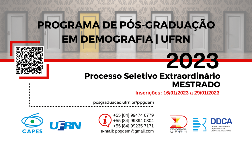 O Programa de Pós-Graduação em Demografia da UFRN abriu edital de processo seletivo extraordinário para ingresso no nível de mestrado. O edital trata sobre o Processo Seletivo Extraordinário para complementação de vagas e ingresso ainda em 2023 apenas para o nível de Mestrado e seguirá o Cronograma de acordo com o Anexo I do Edital. As inscrições estarão disponíveis de 16/01/2023 a 29/01/2023. Para acessar o edital e outras informações consulte o link da notícia na página administrativa do PPGDem.