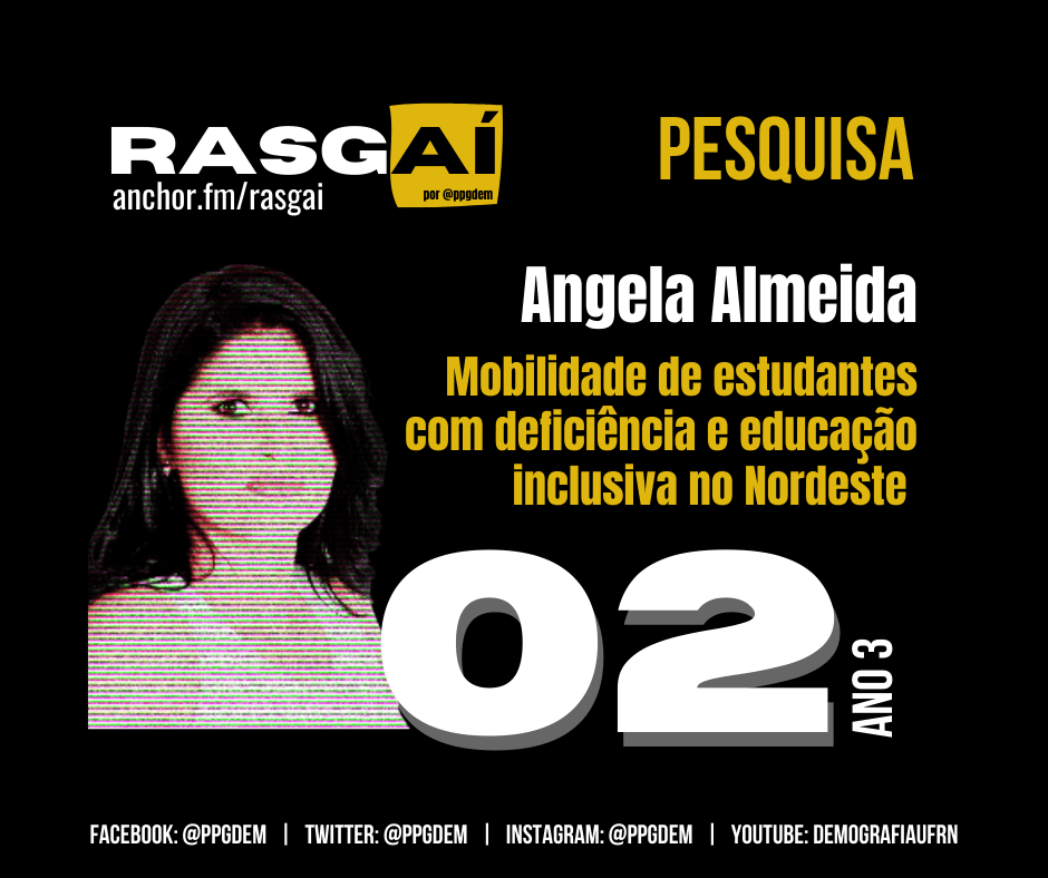 Neste episódio 2 da terceira temporada do Rasgaí, conversamos com a Angela Thais Araujo de Almeida. Ela defendeu a dissertação de mestrado em demografia no Programa de Pós-Graduação em Demografia da UFRN em 2021 e o tema da pesquisa foi a mobilidade espacial e o acesso à educação básica entre jovens com deficiência na região Nordeste. O trabalho se insere no debate sobre avanços e retrocessos que cercam o tema nos anos recentes. O direito fundamental ao acesso à educação para pessoas com deficiência perpassa diversos aspectos e, entre eles está a questão da mobilidade espacial.