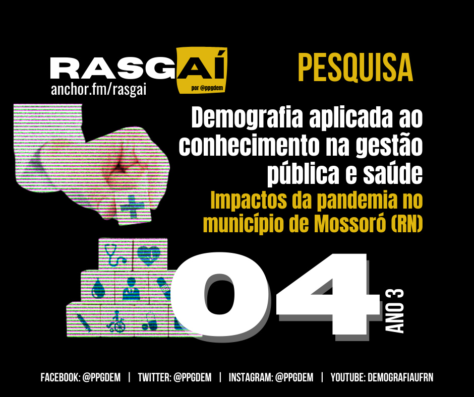 O episódio 4 da terceira temporada apresenta um resumo dos primeiros resultados de um projeto desenvolvido pelo Programa de Pós-Graduação em Demografia da UFRN em parceria com diversas instituições de pesquisa, a Organização Pan-Americana de Saúde (OPAS) e a Prefeitura Municipal de Mossoró (RN). O projeto tem como objetivo subsidiar ações de qualificação, planejamento e informação para a gestão pública municipal a partir de uma perspectiva interdisciplinar em Mossoró na direção de entender os impactos diretos e indiretos da pandemia da Covid-19 no município. Vai além, buscando realizar uma análise prospectiva e de futuro para o planejamento de ações voltadas à melhoria das condições de saúde e qualidade de vida no município.