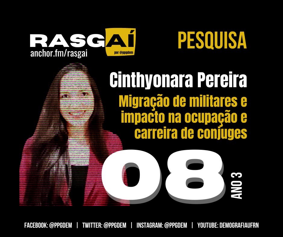 Um exemplo é a mobilidade compulsória que existe dentro de algumas carreiras como, por exemplo, os militares da União. Nesse episódio vamos conversar com a Cinthyonara Targino Pereira. Ela defendeu uma dissertação de mestrado em demografia na UFRN e, baseado nessa pesquisa, publicou o artigo “Migração e atividade econômica das esposas de militares da União e de trabalhadores dos setores público e privado no Brasil em 2010” na Revista Brasileira de Estudos de População onde discute a migração e a atividade econômica das esposas de militares da União e compara a situação com trabalhadoras civis dos setores público e privado. A dissertação da Cinthyonara Pereira pode ser acessada no repositório de teses e dissertações da UFRN clicando AQUI.