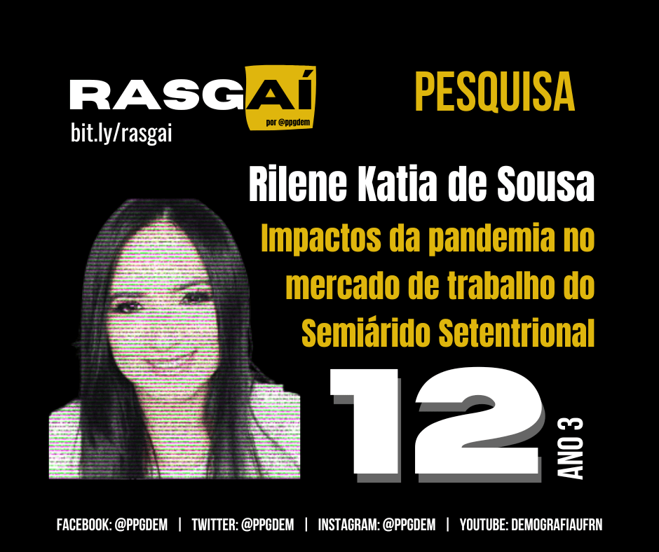 O objetivo é avançar na compreensão dos impactos da COVID-19 no acúmulo de condições desfavoráveis na população dessa região que tem taxas de crescimento populacional baixas e com relativa perda de participação na população na região Nordeste. O Semiárido Setentrional apresenta baixos indicadores sociais, econômicos, de saúde, educacionais, entre outros. Fatores como mercado de trabalho, saúde, infraestrutura, migração e mobilidade já se constituíam como desafios para o desenvolvimento regional antes da pandemia e poucos estudos focam no contexto demográfico da região. Assim, o episódio de hoje traz uma pesquisa de mestrado que foi desenvolvida dentro deste recorte de pesquisa. A Rislene Katia de Sousa defendeu sua dissertação de mestrado em 2022 e analisou o contexto do mercado de trabalho antes e depois da pandemia da Covid-19 na região do semiárido setentrional.