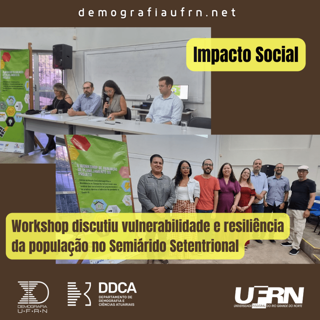 Nos dias 15 e 16 de julho, o Programa de Pós-Graduação em Demografia da UFRN realizou o II Workshop de Avaliação e Planejamento do projeto “Vulnerabilidade Sociodemográfica e Resiliência no Semiárido Setentrional: uma análise das características populacionais e os efeitos diretos e indiretos da pandemia da Covid-19”. O projeto recebeu financiamento das concessões do Edital CAPES 18/2020 e do Edital Fapern 13/2021 voltado ao apoio de programas de pós-graduação em consolidação na área de desenvolvimento do semiárido e conta com recursos de custeio e bolsas de pós-graduação e pós-doutorado. Trata-se de um projeto integrativo onde todos os docentes do PPGDem estão envolvidos direta ou indiretamente com o objetivo de entender melhor as condições de vida e dinâmica da população na região do semiárido setentrional.