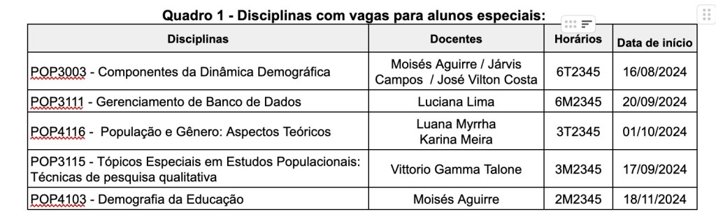 A Coordenação do Programa de Pós-graduação em Demografia da UFRN torna pública esta chamada para matrículas de alunos especiais em disciplinas ofertadas pelo Programa para o período 2024.2 de acordo com as seguintes regras: