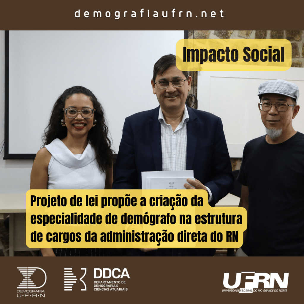 Na ocasião estavam presentes Ricardo Ojima, chefe do DDCA; Luciana Lima, coordenadora PPGDem; e o Secretário de Administração do Governo do Estado. O Projeto de Lei Complementar (PLC) Estadual n. 019/2024 foi enviado à Assembleia Legislativa do Rio Grande do Norte e propõe, no artigo 57, a inclusão da especialidade “demografia” no cargo de Analista Administrativo, Grupo de Nível Superior (GNS).