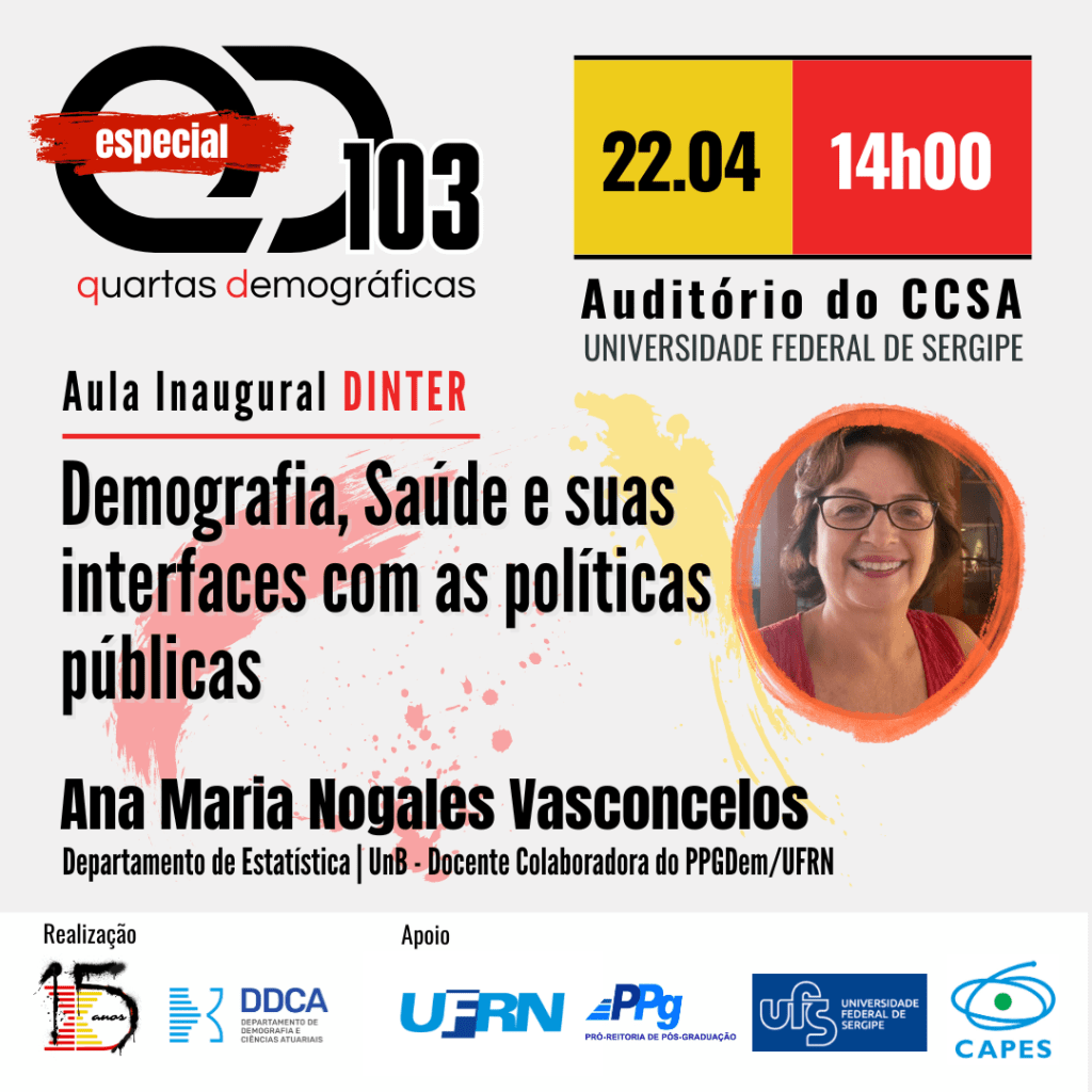 QD103 | Aula Inaugural Dinter | 22.04 | Demografia, Saúde e suas interfaces com as políticas públicas | Ana Maria Nogales Vasconcelos (UnB e PPGDem) | Auditório do CCSA/UFS (Endereço: Andar térreo do Bloco Departamental do CCSA/UFS, localizado na Cidade Universitária, São Cristóvão)