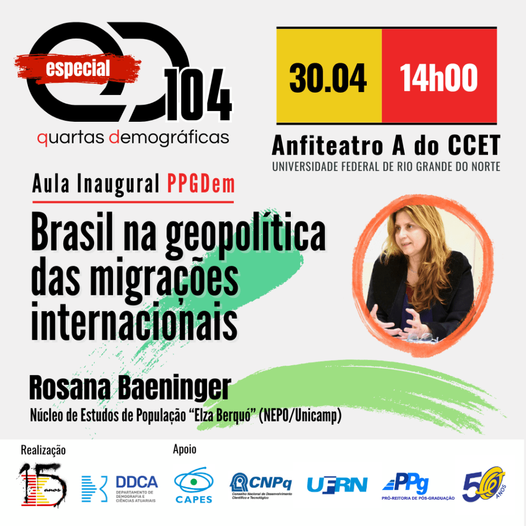 QD104 | Aula Inaugural PPGDem | 30.04 | Brasil na geopolítica das migrações internacionais | Rosana Baeninger (NEPO/Unicamp) | Anfiteatro A do CCET/UFRN